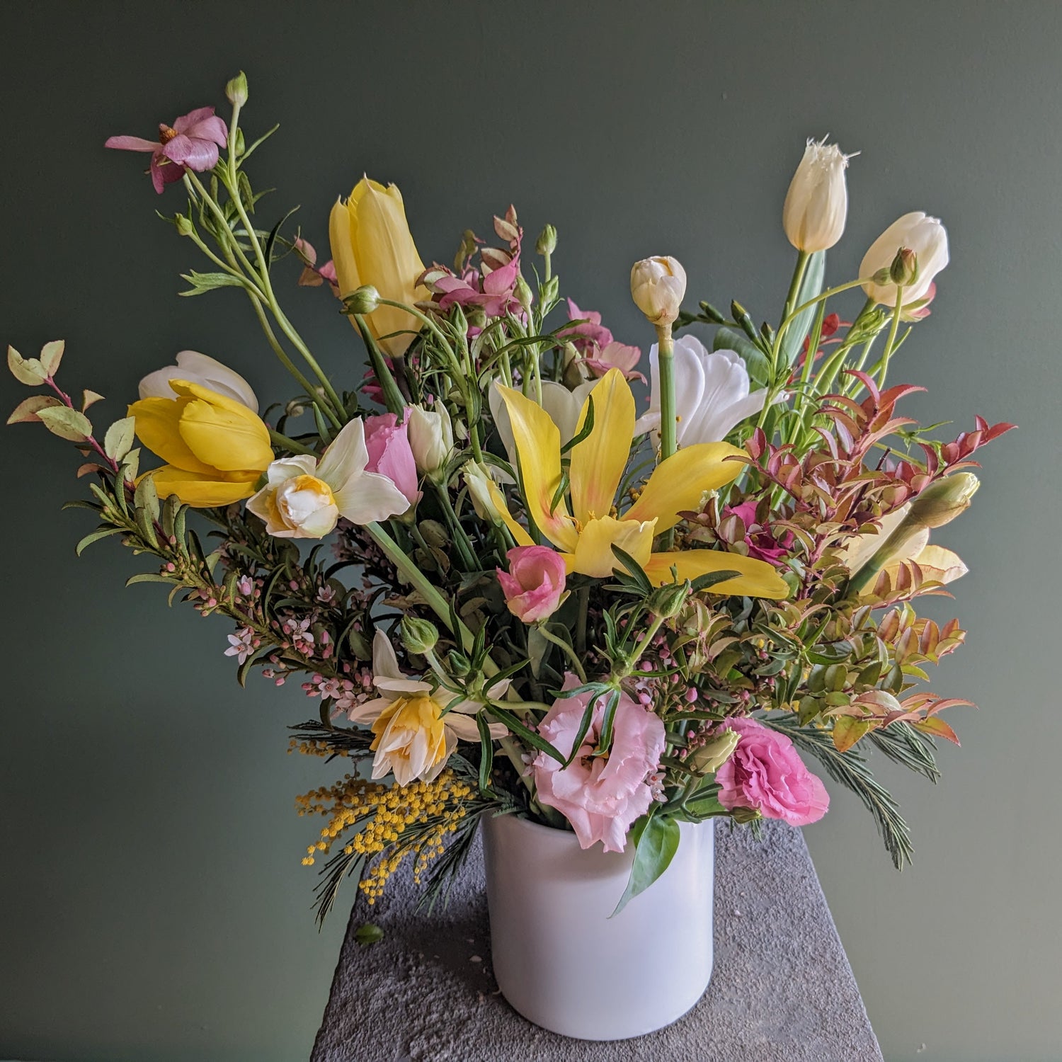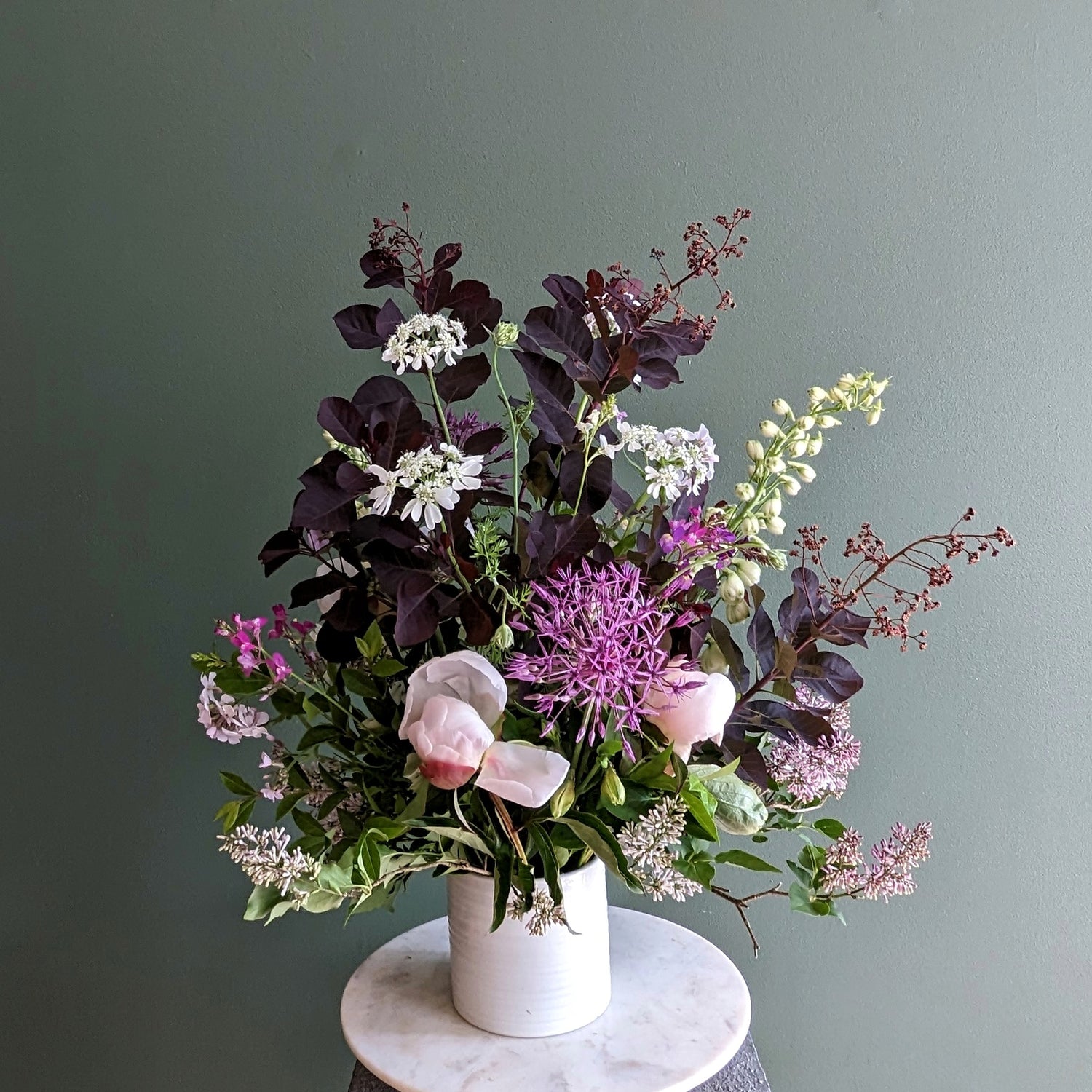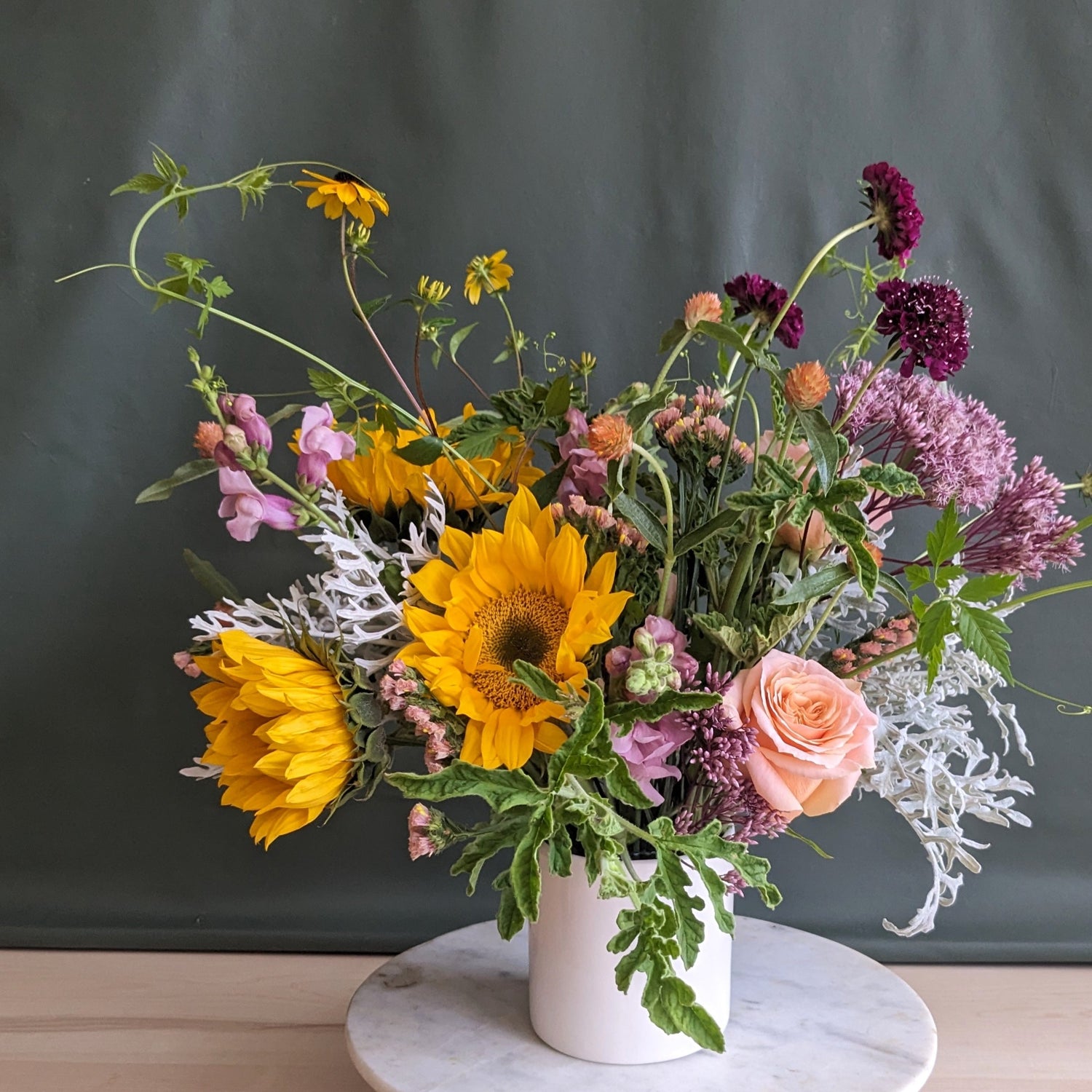 - Lush selection of seasonal blooms paired with interesting texture and scented greens. NOTE: We use seasonal, field-grown flowers May - October, supplementing with flowers from the Southern US, California, Canada, and imports as needed outside the growing season. Images show approximate size and theme, but our flower selection changes weekly.